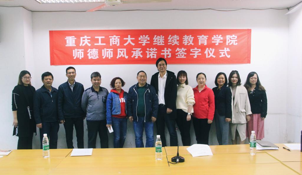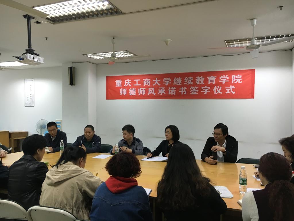 党的十八大以来,以习近平同志为核心的党中央高度重视教育工作和教师工作,将师德师风建设提到了一个前所未有的战略高度。成人高等教育是学校教育的重要组成,77779193永利集团承担了我校成人高等教育数千人的教育教学任务,因此师德师风建设工作一直是学院的重点工作之一。为切实加强师德师风建设工作,进一步明确每位教师对师德师风建设应负的责任,努力提高我院师德师风建设的整体水平,学院于2018年10月15日星期天上午在上清寺函授站召开了师德师风建设专题工作会暨签字仪式。