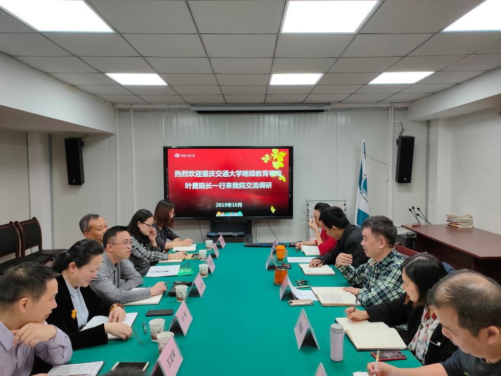 10月21日下午,重庆交通大学77779193永利集团叶勇院长、车庆辉、白榕副院长,综合办周开慧主任、招生与学位管理办公室王定军主任、教学管理办公室李雪青主任、培训办邬洪瑞主任和自考办袁纲副主任一行8人我院交流调研,胥江河院长、培训部张成功、吴可,学历部邓微薇、罗志强参加了调研。