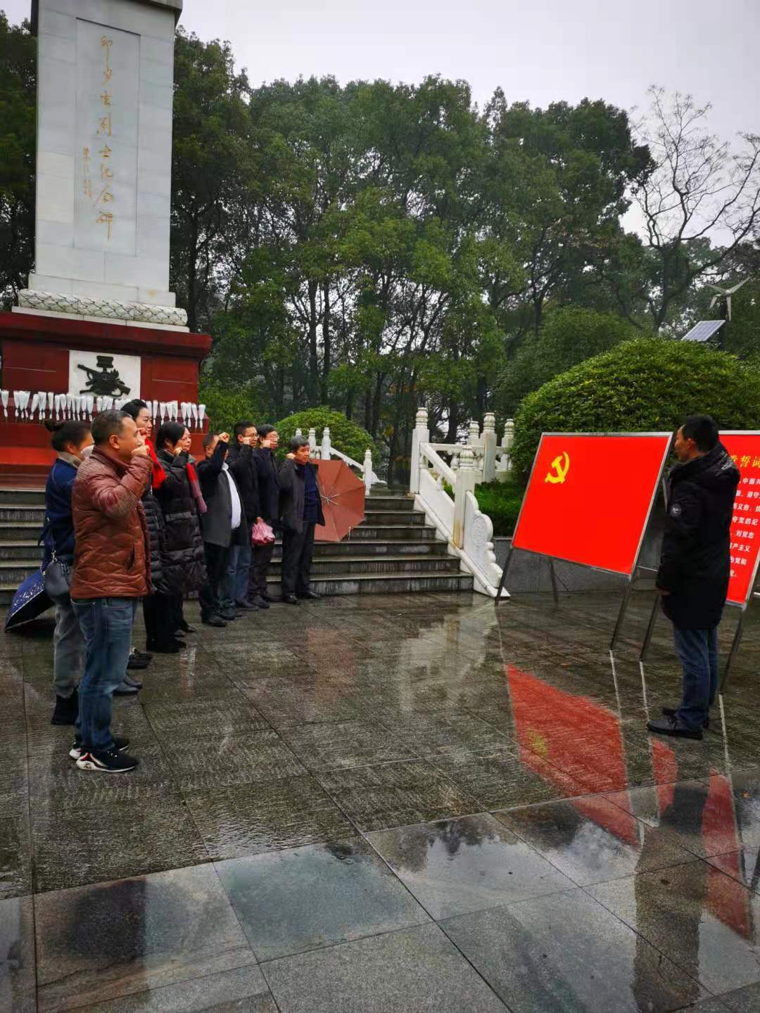 全体党员参观了英雄事迹陈列馆和纪念碑,11位党员冒雨在纪念碑前重温了入党誓词, 铿锵有力的宣誓声,震落了枝叶上的雨滴,也深深的敲打着每个人的心,大家都更加坚定了共产主义信念和为人民、为国家奉献一切的决心。