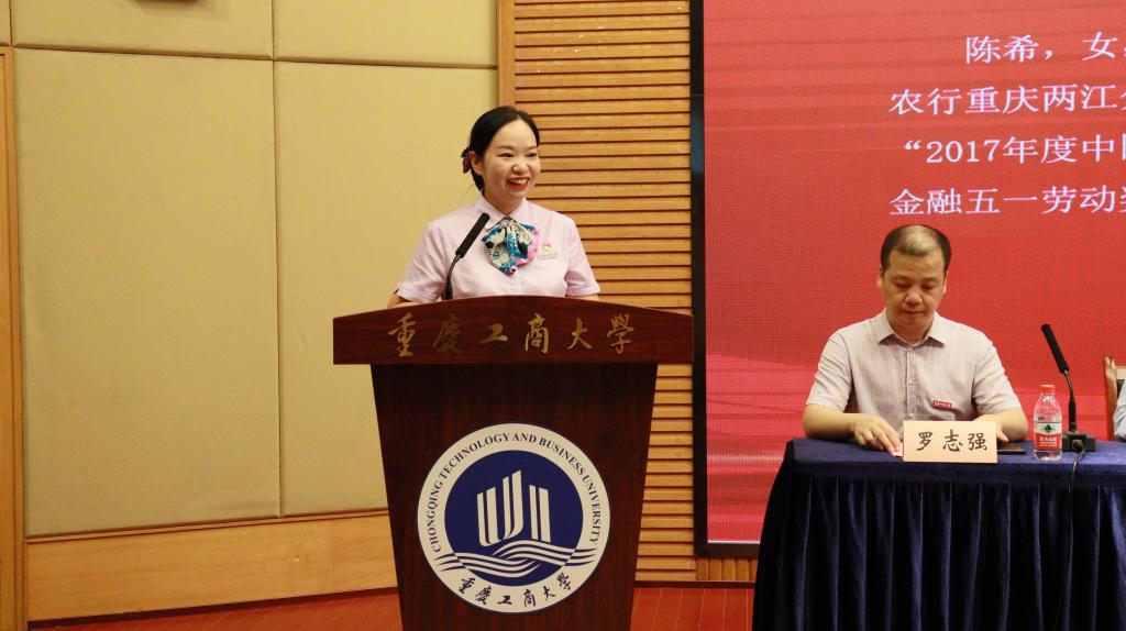 优秀校友、2013级成教毕业生、全国五一劳动奖章获得者、农行重庆两江分行营业部高级大堂经理陈希以分享了自己的成长故事。她回忆因为自身局限和职业发展需求,选择重庆工商大学成教工商管理专业提升学历,在校期间,除了认真完成学业任务外还积极利用课余时间,参加校内外的各项活动和社会实践,为今后在工作中取得的成绩奠定了基础,她祝福母校七十周年华诞,也希望学弟学妹们和自己一起,努力学习和工作,以优异的成绩向母校献礼。