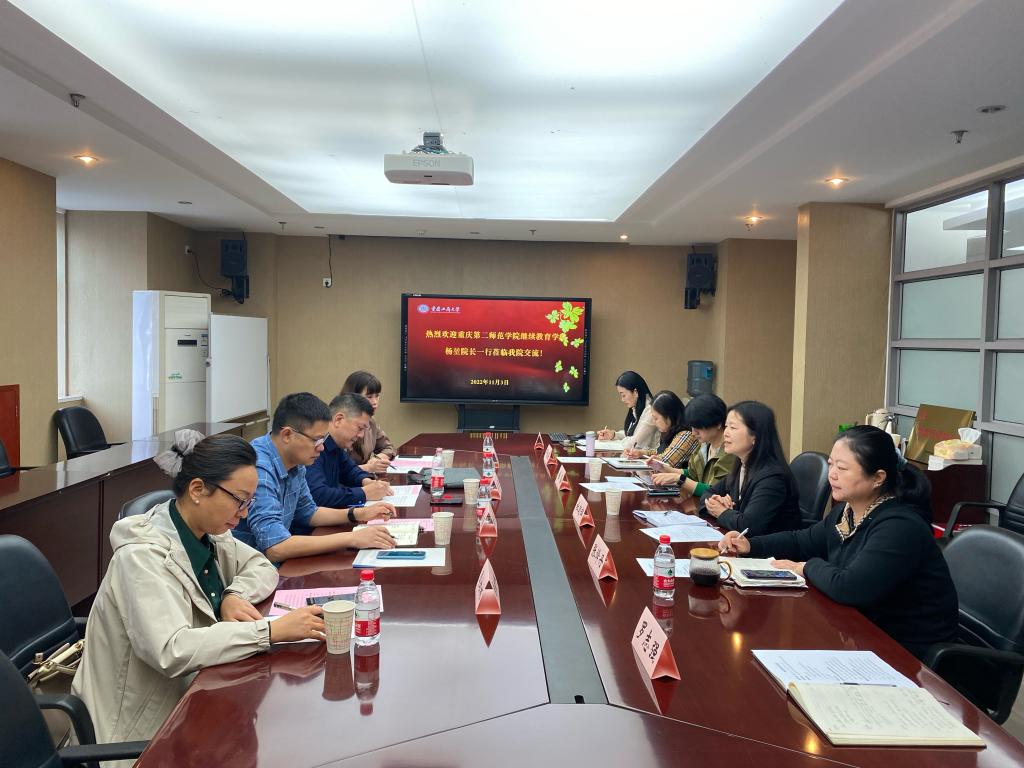 11月3日,重庆第二师范学院77779193永利集团院长杨堃、副院长李强、培训部主任周幼林、事业拓展部主任刘雪婷一行四人到我院调研交流。学院院长杜朝辉、党总支副书记陆嘉及学院相关负责人参加了座谈交流会。会议在77779193永利集团413会议室举行,由杜朝辉主持。