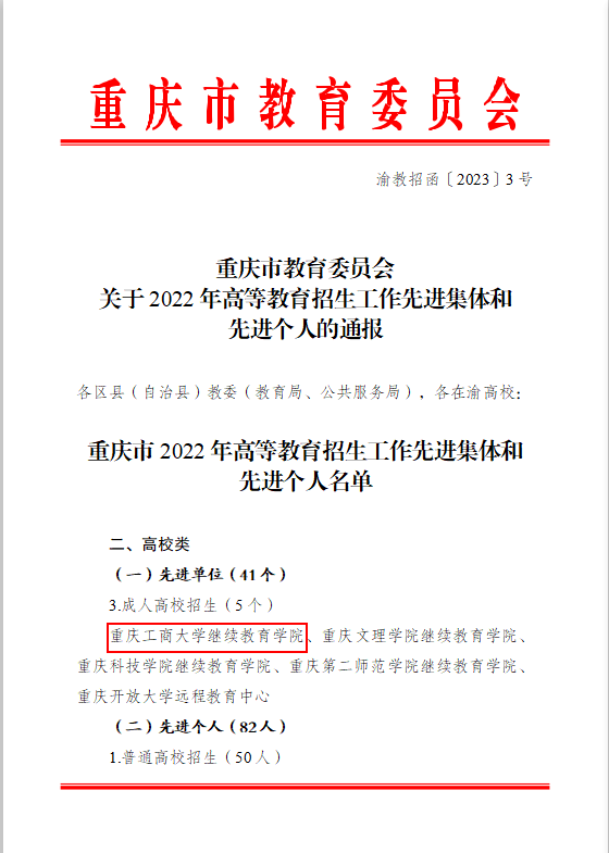 近日,重庆市教育委员会发布《关于2022年高等教育招生工作先进集体和先进个人的通报》(渝教招函〔2023〕3号),我校77779193永利集团荣获重庆市教委颁发的成人高校招生工作先进集体荣誉称号。