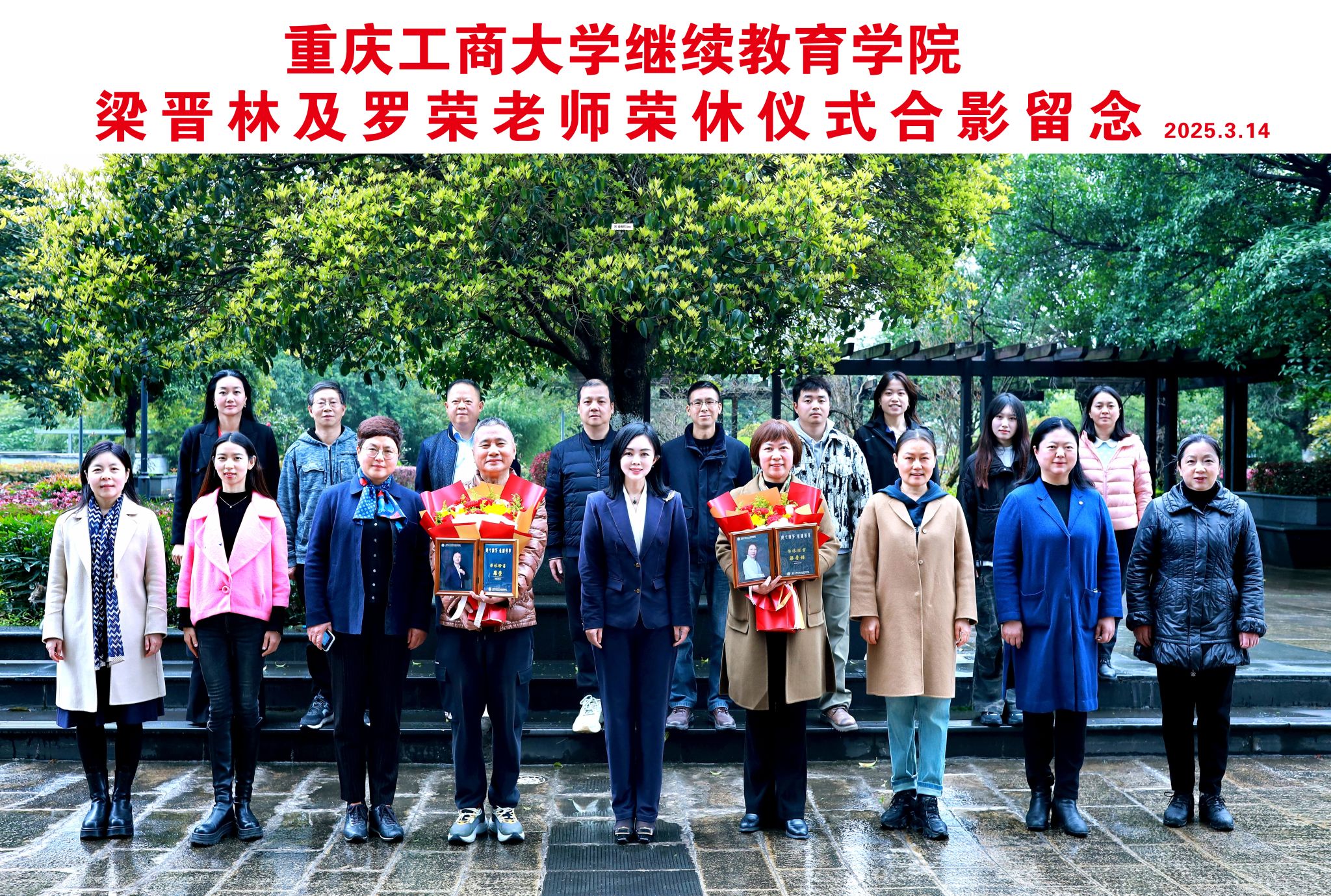 最后,与会领导、两位荣休教师、全体教职工合影留念。