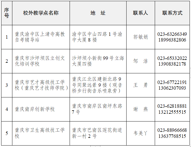 以上5个教学点经重庆市教委批准设立,属我校高等学历继续教育合法合规的教学点,承担相应的教学及管理工作。特此郑重声明: