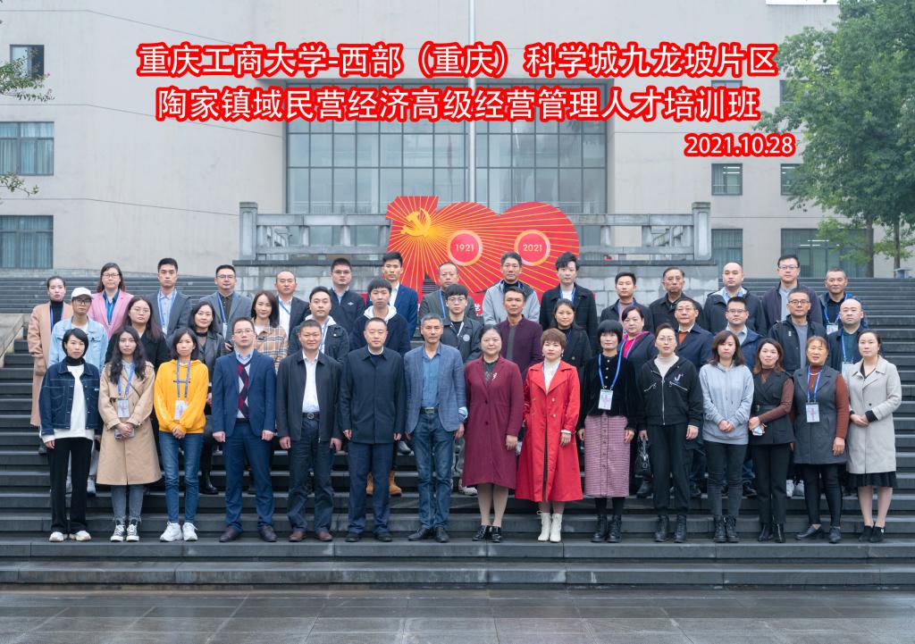 2021年10月28日,西部(重庆)科学城九龙坡片区陶家镇域民营经济高级经营管理人才培训班在重庆工商大学南岸校区新图书馆举行开班典礼。陶家镇宣传委员、统战委员奉虎、重庆百可中小微企业公共服务中心主任冉洪斌带队参训并在开班典礼上讲话。西部(重庆)科学城九龙坡片区陶家镇域民营企业经营管理人才共53人参加了培训。