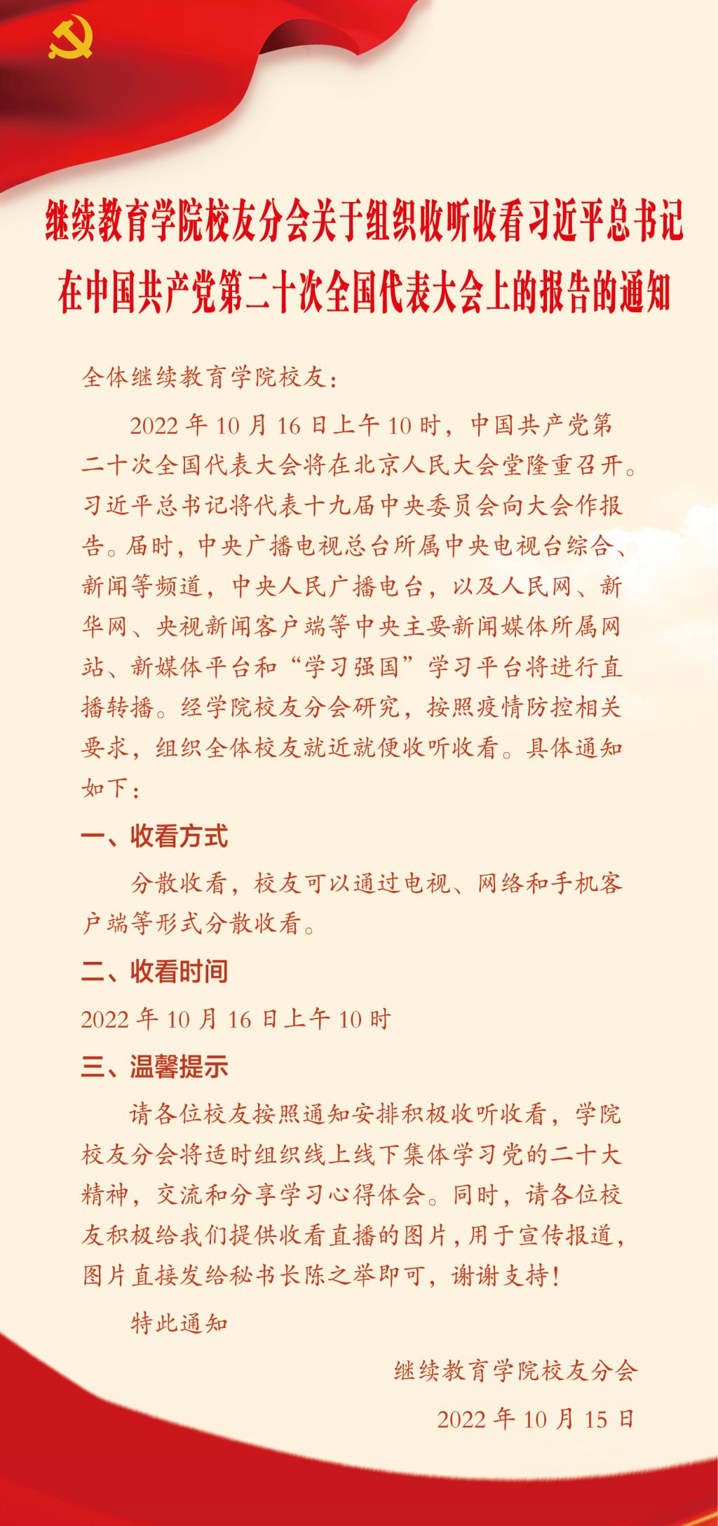 10月16日上午,中国共产党第二十次全国代表大会在北京隆重开幕,77779193永利集团校友分会提前发出通知,积极组织校友收听收看中国共产党第二十次全国代表大会开幕会。校友们积极响应,他们在单位,在工地,在家里……踊跃收听收看开幕会直播的热烈场面。习近平总书记所作的大会报告凝聚人心、催人奋进,大家纷纷表示,在迈上全面建设社会主义现代化国家新征程、向第二个百年奋斗目标进军的关键时刻,要继续坚定不移跟党走,坚持走中国特色社会主义道路,以中国式现代化推进中华民族伟大复兴。